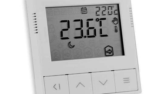 Écran LCD 2,8" (sans rétroéclairage), détection de température sélectionnable par l’utilisateur – uniquement ambiante, uniquement sol ou les deux valeurs. Programme hebdomadaire – jusqu’à 6 changements de température par jour entre les températures confort et réduite prédéfinies, mode manuel, mode protection antigel (5°C). Possibilité d’arrêt logiciel du thermostat, fonction optionnelle « Détection de fenêtre ouverte », verrouillage des commandes (sécurité enfant).