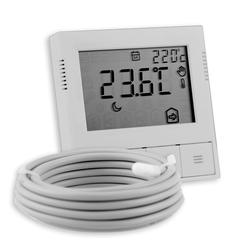 LCD displej 2,8" (bez podsvietenia), používateľsky voliteľné snímanie teploty – len priestoru, len podlahy alebo oboch hodnôt. Týždenný program – až 6 zmien teploty denne medzi prednastavenou komfortnou a útlmovou teplotou, režim manuálneho ovládania, režim ochrany proti mrazu (5°C). Možnosť softvérového vypnutia termostatu, voliteľná funkcia „Detekcia otvoreného okna“, možnosť uzamknutia ovládania (detský zámok).